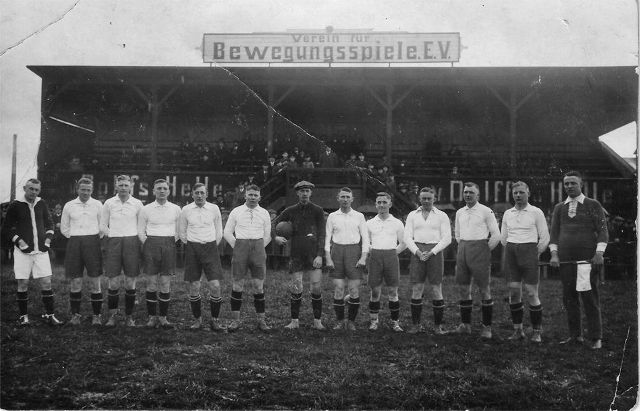 Anhang: 1. Fußballmannschaft  vor der Holztribüne am Madamenweg (Anfang der 1920er Jahre)