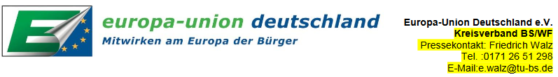 Die Europäische Union hat nur eine Zukunft, wenn sich ihre Bürgerinnen und Bürger besser kennenlernen und so eine gemeinsame europäische Identität entwickeln kann. Deshalb fordern wir als Europa Union eine stärkere Förderung von Städtepartnerschaften und ein kostenloses Interrail Ticket für alle EU-Bürger zu ihrem 18. Geburtstag“, sagt Friedrich Walz, stellv. Kreisvorsitzender der Europa-Union.