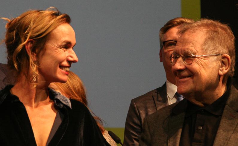 Festivaldirektor Michael P. Aust bei der Preisverleihung mit seinen Stargästen Sandrine Bonnaire und Irmin Schmidt. Foto: Marcus von Bucholz