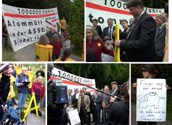 Mit den Liedern „Glück auf, Glück auf, der Ausschuss kommt“ und „He-ho, leistet Widerstand, gegen den Atommüll hier im Land“ wurde der niedersächsische Untersuchungsausschuss von einem Teil des Allerwelt-Chores aus Evessen beim Betreten des Informationszentrums Asse begrüßt. Rund 40 Atomkraftgegner, z. T. in Tonnenkostümen, hatten sich eingefunden, um dem Ausschuss ein Glück auf! für seine anschließende Fahrt in den Schacht und für seine künftige Arbeit zu wünschen.