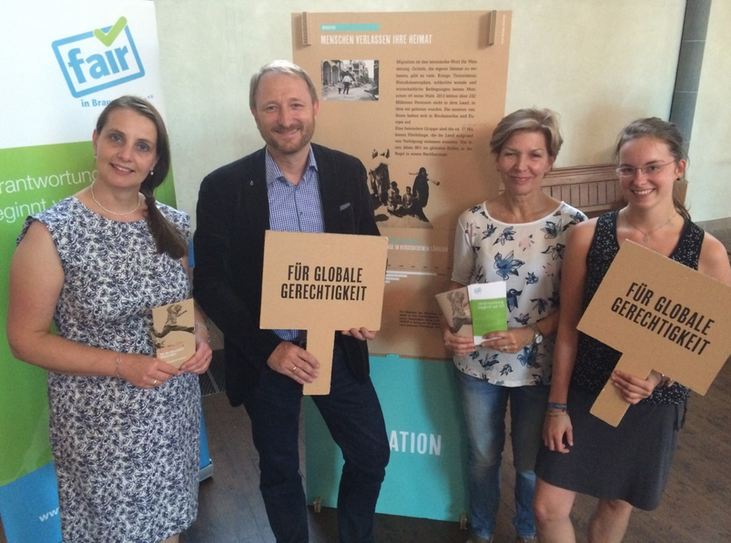 Von links: Kathrin Achilles (Wirtschaftsdezernat), Lars Dedekind (1. Vorsitzender von FiB), Renate Sievers-Altermann (Vorstand FiB), Tanja Mühle (Regionalpromotorin bei Fair in Braunschweig e. V. und Ansprechpartnerin. Alle Mitglied der Steuerungsgruppe Fairtrade -Town)