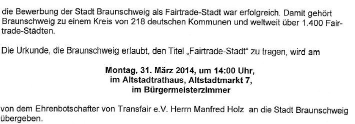 Da ist doch Freude angesagt. Endlich wird unsere Stadt Fair Trade Town. Damit reiht sich Braunschweig ein in eine Gemeinschaft, die einen hohen Anspruch hat. Natürlich sind damit auch Verpflichtungen verbunden, die nicht nur formal betrachtet werden sollten. Es ist die Verpflichtung, den Fairen Handel in unserer Stadt zu fördern. Und das lässt aufhorchen, wenn die Presseerklärung des Stadtmarketings zum Umzug der Touristeninfo achtsam gelesen wird.