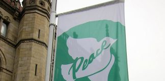 Mayors For Peace: Hissen der Fahne vor dem Rathaus