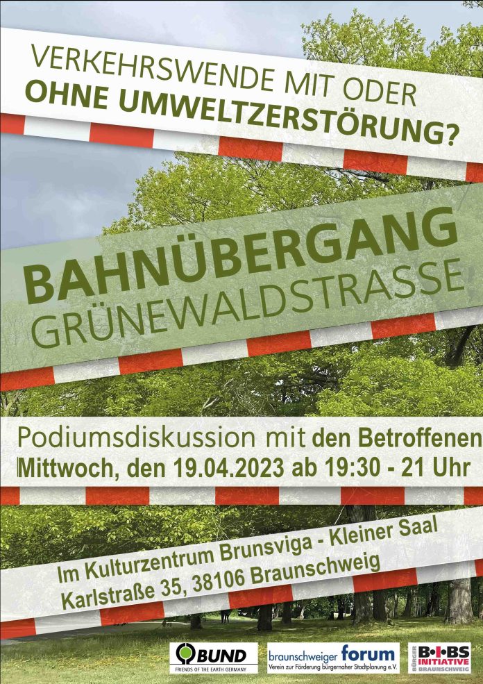 LokalesUmwelt Bahnübergang Grünewaldstraße: Verkehrswende mit oder ohne Umweltzerstörung? Von Gastbeitrag - 17. April 2023 0 Teilen FacebookTwitterWhatsAppLinkedinEmail Von BIBS-Fraktion Podiumsdiskussion zum Thema Bahnübergang an der Grünewaldstraße Mittwoch, 19.04.2023 um 19:30 Uhr in der Brunsviga (kleiner Saal) Eine Veranstaltung von BIBS, Braunschweiger Forum und BUND