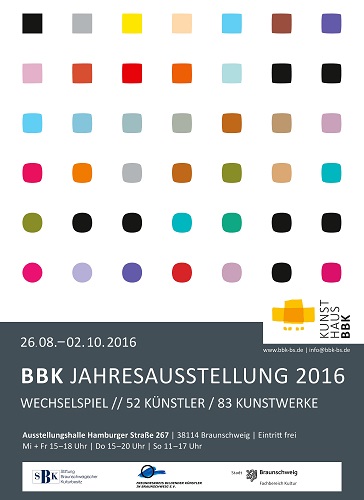 Zur Vernissage der Jahresausstellung „Wechselspiel“ lädt der BBK Braunschweig am 25. August 2016 um20 Uhr ins raumLABOR an der Hamburger Straße 267. 52 Künstler*innen präsentieren in der großzügigangelegten Ausstellungshalle insgesamt 83 Positionen. Der Ausstellungstitel „Wechselspiel“ bietet Raum für eine Vielzahl von Interpretationsansätzen, die über formale Anhaltspunkte bis hin zu tiefgründigen inhaltlichen Fragestellungen reichen.