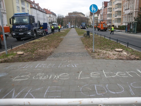 Heute, um 6 Uhr in der Früh, begann das Töten der Bäume. Die Stadt hat darin Übung. Man denke nur an den Schlosspark und den Querumer Forst. Die SPD heutzutage und OB Markurth treten in die Fussstapfen des OB Hoffmann und Borek. Auch die SPD hätte es gerne aristokratischer in Form einer Lindenallee. Foto Uwe Meier