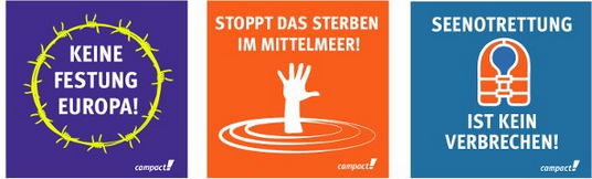 Doch damit kommen sie nur durch, wenn Bürger/innen wegsehen. Und diesen Gefallen tun wir denen, die auf Gewalt, Abschreckung und Stacheldraht setzen, nicht. Auf dem Briefkasten, auf dem Laptop, auf dem Auto: Zehntausendfach bringen wir die Rettungsweste mit Aufklebern in die Öffentlichkeit. Mit deutlichen Forderungen an jeder Straßenecke sagen wir der Politik: Stoppt das Sterben im Mittelmeer! Hört auf, den rechten Hetzern hinterher zu laufen – wir wollen eine andere, eine menschliche Politik.