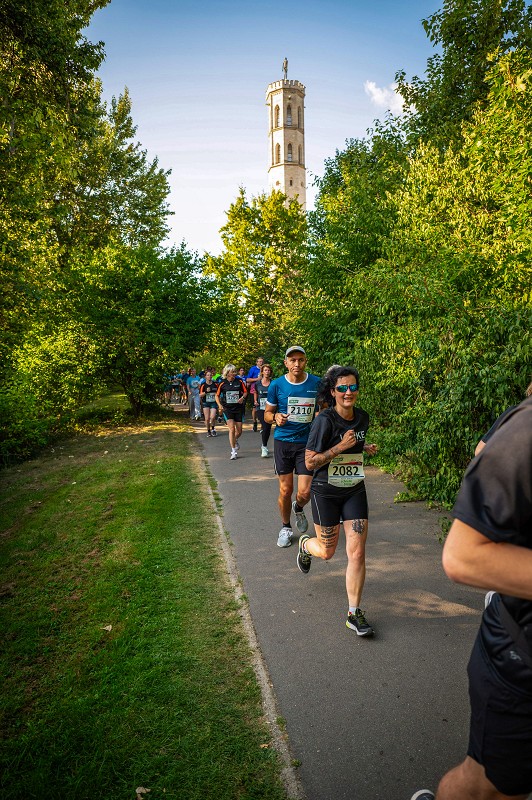Die Strecke führte uns durch den Bürgerpark – ein wunderschönes, grünes Ambiente mitten in Braunschweig. Die Sonne stand schon tiefer, goldenes Licht fiel durch die Bäume am Okerufer, und in der Luft tanzten kleine Staubpartikel wie funkelnde Punkte. Man hörte das Knirschen der Laufschuhe auf dem sandigen Boden, das rhythmische Atmen der Läuferinnen und Läufer, und immer wieder brandete Jubel von den Zuschauern auf. Entlang des Weges standen Familien mit Kindern, ältere Menschen auf Bänken, junge Studierende mit bunten Schildern – sie alle schenkten uns ein Lächeln und riefen aufmunternde Worte. Dazu spielten Musiker, Trommelgruppen gaben den Rhythmus vor, und es fühlte sich an wie ein fröhlicher Umzug durch die Natur. Überall liefen Teams aus den verschiedensten Braunschweiger Unternehmen, manche sogar mit ihren Hunden. Dieses bunte Miteinander schuf eine einmalige Atmosphäre.