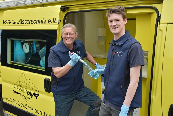 Dr. Matthias Ahlbrecht und Milan Toups führen die Grunduntersuchung von Nitrat-, Säure-und Salzgehalt im Labormobil gegen eine geringe Beteiligung von 12 € durch. Nachdem das Analyseergebnis vorliegt, beraten die Gewässerexperten was die festgestellte Belastung für die Nutzung des Wassers bedeutet. Gegen eine Kostenbeteiligung werden weitere Parameter untersucht. Die Brunnenbesitzer bekommen die Ergebnisse, ob das Wasser zum Trinken, zum Gemüse gießen, zum Teich oder Planschbecken befüllen geeignet ist, in einem ausführlichen Gutachten mit der Post zugesandt.