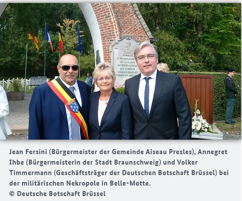 Zum wiederholten Male war unsere Bürgermeisterin Annegrat Ihbe (SPD) nun schon bei den Feierlichkeiten zum Gedenken der belgischen und braunschweiger Toten in Roselies. Diesmal nahm auch die Deutsche Botschaft teil und stellte einen Bericht auf ihre Webseite. Die zunächst respektvollen und zunehmend auch freundschaftlichen Bande zwischen Braunschweig und Roselies sind erfreuliche Zeichen der Mitmenschlichkeit und gegenseitigen Respekts in einer Europäischen Union, die sich immer mehr zerstreitet. Mit der überzeugten Europäerin Annegret Ihbe, gelingt es immer wieder die wichtigen Brücken zur Freundschaft zu schlagen.