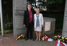 Bürgermeisterin Annegret Ihbe (SPD) und BIBS-Ratsherr Peter Rosenbaum vor dem "Monument aux Morts" in Roselies (Ortsteil der Gemeinde Aiseau-Presles)