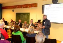 Foto (Ulrich Schwarze): Dr. Diethelm Krause-Hotopp (rechts) begrüßte die zahlreichen Zuhörer/innen. Auf dem Podium von links: Detlef Kaatz (Bürgermeister Cremlingen), Christian Müller (stellv. Samtgemeindebürgermeister Sickte), Paula Neubauer (Elternvertreterin), Walter Herrmann (Moderator), Brigitte Rössing (Schulleiterin Comeniusstraße Braunschweig) Andreas Meisner (Schulleiter IGS Franzsches Feld Braunschweig) und Gudrun Wollschläger (Landkreis Wolfenbüttel).