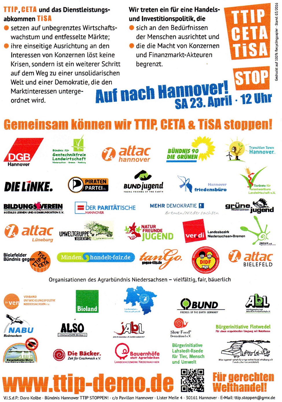 Wir demonstrieren am Samstag, den 17. September 2016 gleichzeitig in sieben Städten – Berlin, Frankfurt/Main, Hamburg, Köln, Leipzig, München und Stuttgart gegen TTIP und CETA. Seid dabei! weiterlesen