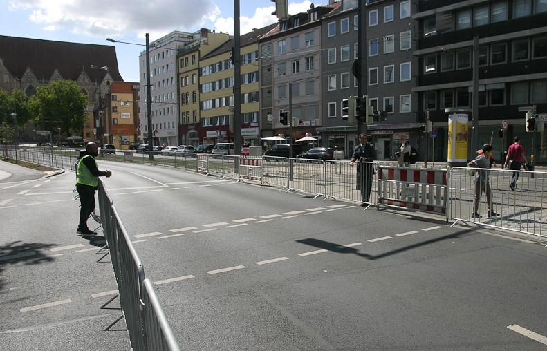 Da half kein Betteln und kein Flehen: Trotz leerer Rennstrecke schickte die Security die Fußgänger vom Damm bis zum Kennedy-Platz weiter. Foto: Klaus Knodt