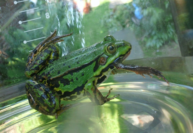 Dieser Teichfrosch frisst gerade einen Grasfrosch. Kannibalismus ist keine Ursache der Artenverarmung. Alle Frösche sind hoch gefährdete Amphibien, weil Feuchtgebiete (auch Gärten) vernichtet werden. Foto: Uwe Meier