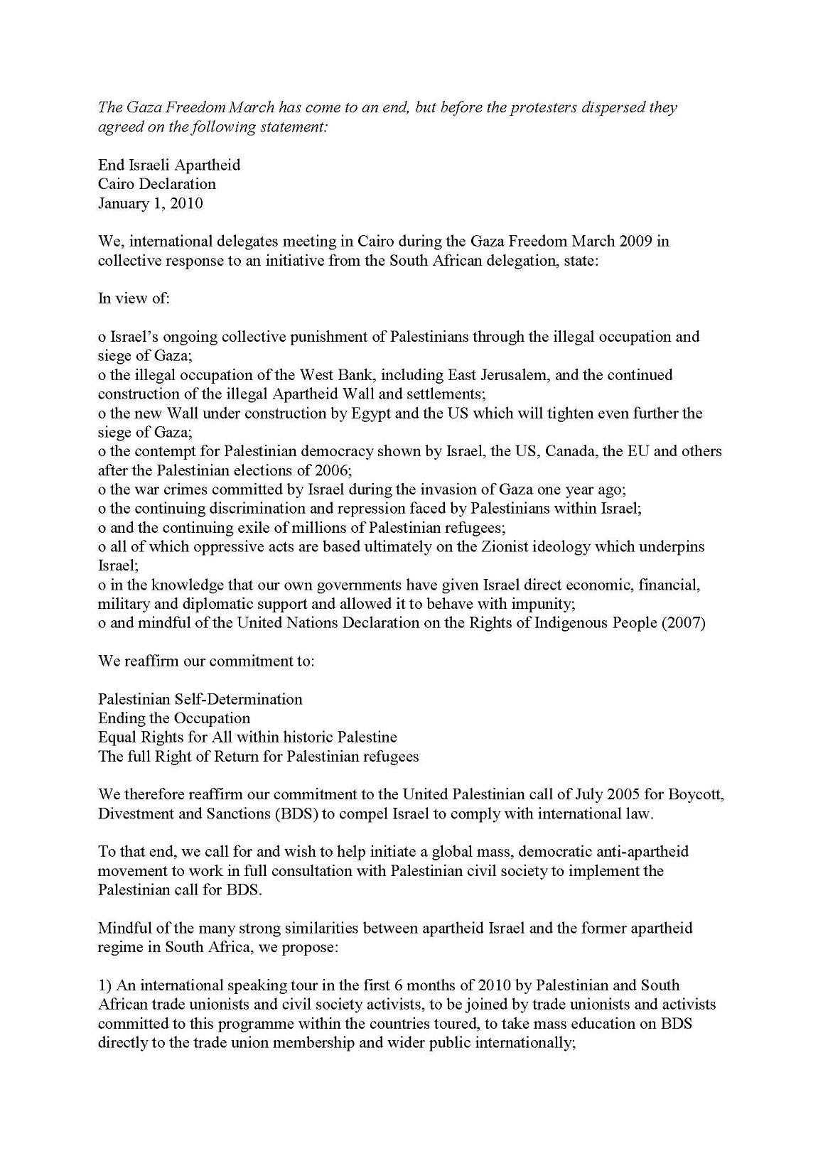 Cairo Declaration: http://mondoweiss.net/2010/01/gaza-freedom-marchers-issue-the-cairo-declaration-to-end-this-chapter-and-chart-the-way-forward.html