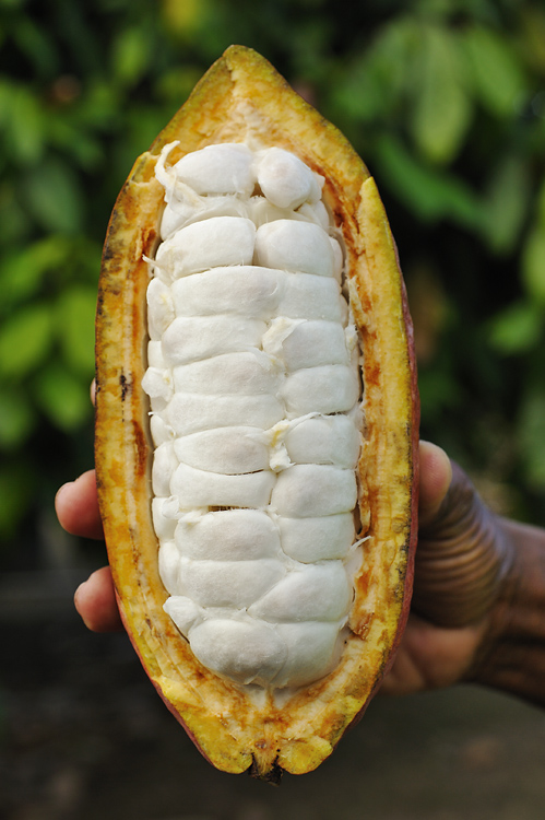 Links: Kakaofrucht im Inneren. Die kleinen weißen geschichteten „Pakete“ bestehen aus einem leichten süßen Gewebe. Darin sind die Samen, die keine Bohnen sind, aber „Kakaobohnen“ genannt werden.