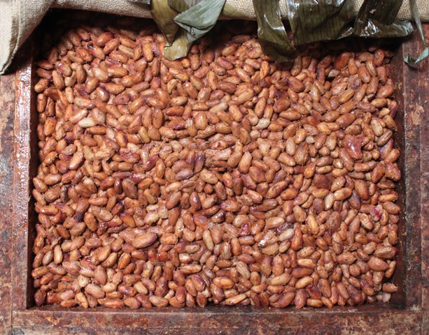 Fermentation: Das weiße Gewebe zerfällt und der Keim stirbt ab durch die Milchsäure/Essigsäuregärung unter Sauerstoffabschluss bei 42-48 Grad . Die „Kakaobohnen“ werden sichtbar.