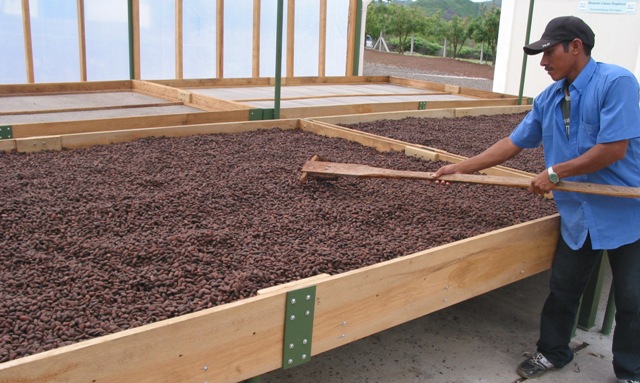 Kostenintensive Trocknung der „Kakaobohnen“ auf Edelstahl-Netztischen in Matagalpa (Nicaragua). Hier bei „Ritter Sport“.