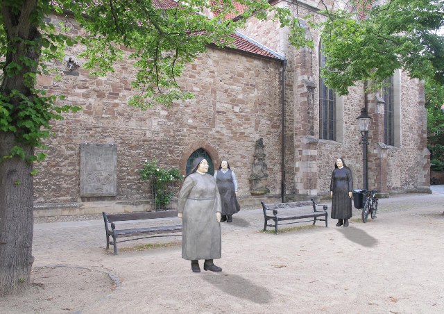 Fotomontage: Diese drei Nonnen der Künstlerin Christel Lechner werden ab 7. Mai auf dem Magnikirchplatz stehen.