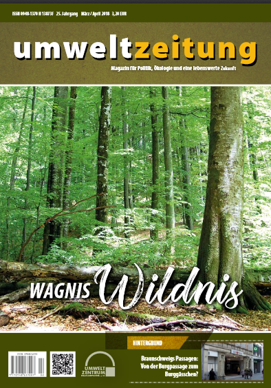 Spannend hingegen wären die paar hundert Jahre des Übergangs, wenn eben ehemalige Kulturflächen wieder in ihren Wildzustand übergehen – in diesem Fall ist das auch ein Urzustand. Von solchen Flächen gibt es einige, sogar in der Stadt, wie die Autoren des Titelthemas der neuen Umweltzeitung deutlich machen. Tatsächlich gewinnt auch eine Stadt wie Braunschweig, wenn man da und dort der Natur freie Hand lässt, wachsen lässt, was dort gerade wächst ohne zu fragen, ob das Wildkraut ein Neophyt oder Unkraut oder sonst etwas ist, sondern wirklich Wildnis wagt. Mit allem, was dazu gehört. Und nein, Wölfe werden sich dann nicht auf dem Kohlmarkt tummeln …