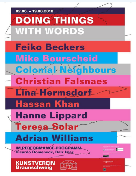 Die Gruppenausstellung DOING THINGS WITH WORDS präsentiert, erforscht und hinterfragt aktuelle Tendenzen sprach- und performancebasierter Werke. Die eingeladenen Künstler_innen verbindet ein besonderes Interesse an einer körpergebundenen Sprache, die untrennbar mit der Bewegung der Performer_innen oder Besucher_innen verknüpft ist. Einladung auf PDF