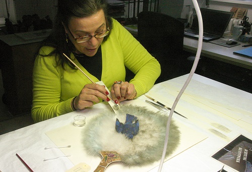 „Um genau kontrollieren zu können, was ich tue, muss ich den festsitzenden Staub Millimeter für Millimeter mit dem Pinsel oder Wattestäbchen entfernen.“ Die letzte, besonders hartnäckige Schicht wird sogar mit einer speziellen Knetmasse gebunden und abgenommen. Für die Aufarbeitung eines Federfächers aus der Gegend der Niagara-Fälle, bei dessen Reinigung Feder für Feder einzeln gewaschen wird, setzt sie 3 Tage Arbeit an: „Pro Tag schaffe ich 10 Zentimeter. Dabei handelt es sich nur um Staub, denn das Objekt war gut gelagert.“ Wenn Mottenfraß oder Materialversprödung dazu kommen, wird’s noch aufwändiger.