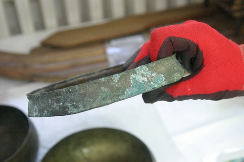 Dieses über 1000 Jahre alte Schälchen ist im Lauf der Zeit korrodiert. Es darf nur mit Handschuhen angefasst werden, wenn es rein mechanisch gereinigt wird.