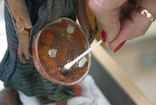 Mit Wattestäbchen und Spezial-Knetmasse wird millimeterweise verkrusteter Staub von einem 5 Zentimeter großen Exponat entfernt.