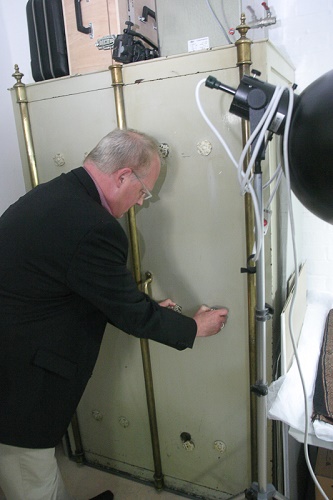 Der alte Tresorschrank in der Restaurierungs-Werkstatt stellt auch Museumsdirektor Dr. Peter Joch vor Probleme. Das schöne Stück nimmt Platz weg, darf aber aufgrund seines Gewichts nur im Souterrain stehen.