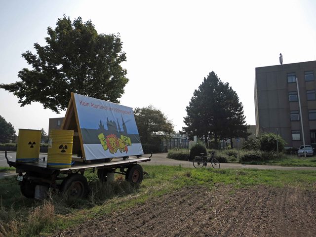 Neben dem Gelände der Firma E&Z steht ein ständiges Mahnmal mit Hinweisen zum Atommüll im Siedlungsgebiet und dem schlafenden Braunschweiger Löwen. Foto: U. Meier