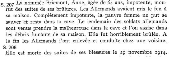 Da wurde der 64 jährigen, bewegungsbehinderten Anne Briemont, von den deutschen Soldaten nicht aus ihrem Haus geholfen, als sie es anzündeten. Als das Haus abgebrannt war, holte man sie aus dem Keller und setzte sie mit ihren schweren Brandverletzungen in die rauchenden Trümmer ihres Hauses. – Warum? Mit welcher Motivation? War das Teil des „Aufräumens“, weil man sonst nicht wusste, wohin mit ihr? Zum Spott – zum Vergnügen der deutschen Soldaten? – Schließlich wurde sie von deutschen Soldaten doch zu einer Nachbarin gebracht. Am 29. November 1914, gut drei Monate später, ist Anne Briemont dann an ihren schweren Brandverletzungen gestorben. – Sie hat unter der deutschen Besatzung kein gutes Leben gehabt.