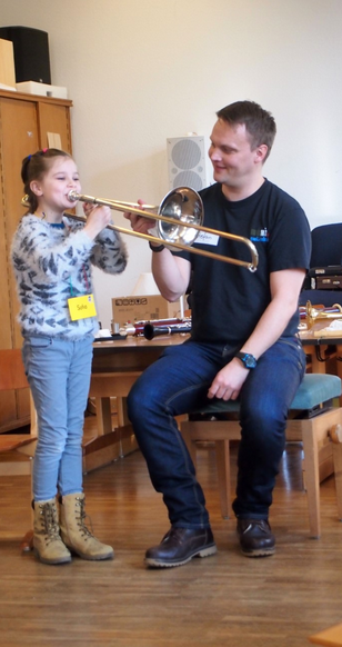 Stefan Schmicker, Posaunenlehrer an der Städtischen Musikschule, hat eine ganze Auswahl an Blasinstrumenten in seinem Raum – von der Querflöte bis zur Tuba. Seit letztem Herbst erklärt er einer Hälfte einer Grundschulklasse die unterschiedlichen Blech- und Holzblasblasinstrumente eines Sinfonieorchesters im Kooperationsprojekt zwischen der Städtischen Musikschule, dem Staatstheater Braunschweig und der Bürgerstiftung Braunschweig. Es bleibt aber nicht beim Erklären, denn jeder darf selbst mal ausprobieren. Bei jedem Kind klingt ein Instrument anders – manchmal kommen nur Walfischtöne heraus und manchmal klingt es schon nach vielversprechender Musik.