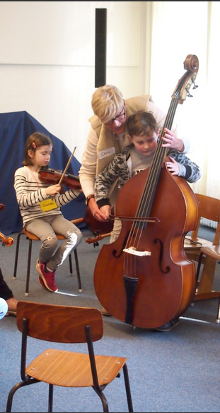 Dorothee Pöhl, Lehrerin für Violoncello, bringt der anderen Klassenhälfte parallel Streichinstrumente näher. Woraus ist der Bogen gebaut und wie hält man die Geige richtig? Dass der Kontrabass immer größer ist, als die Schülerinnen und Schüler sorgt für ordentlichen Respekt. „Kaputt gegangen ist übrigens bisher noch nichts“, freut sich die Musikpädagogin. Danach tauschen die Gruppen.