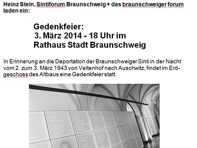 Einladung in Erinnerung an die Deportation Sinti von Braunschweig nach Auschwitz am 3. März 1943