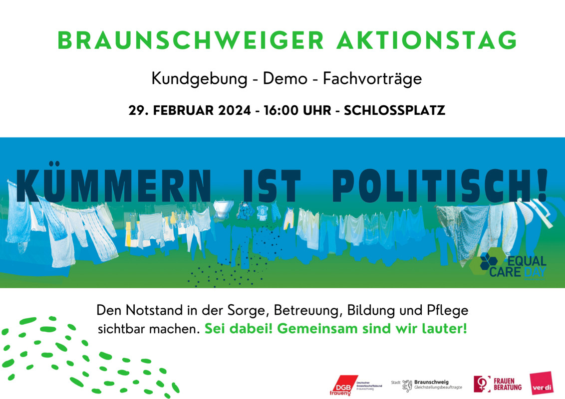 Um 16 Uhr beginnt die Kundgebung auf dem Schlossplatz mit einem Grußwort der Bürgermeisterin Cristina Antonelli-Ngameni und weiteren Redebeiträgen. Im Anschluss ist eine Demo durch die Innenstadt geplant. Um 17.30 Uhr wird die Abschlussveranstaltung im Roten Saal durch Nicole Kumpis, Vorständin des DRK, eröffnet.  Es folgen Impulsvorträge durch Professorinnen der TU Braunschweig. Studierende der HBK werden Care-Clips präsentieren.