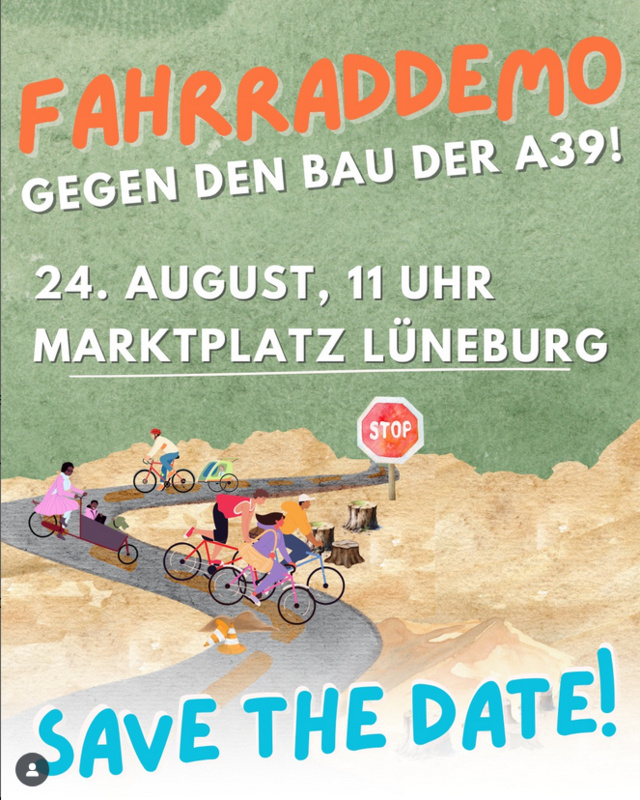 Obwohl wirklich alles dagegen spricht, plant die Autobahn GmbH noch dieses Jahr mit dem 100 km langen Neubau der A39 zwischen Lüneburg und Wolfsburg zu beginnen. Nicht mit uns! Wir treten ein für menschen- und klimagerechte Verkehrspolitik – am 24.8. mit einer Fahrrad-Großdemo in Lüneburg.