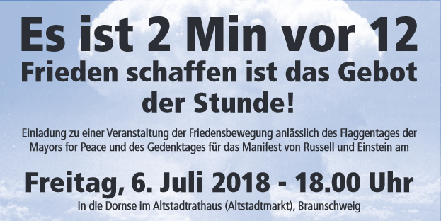 Einladung zu einer Veranstaltung der Friedensbewegung anlässlich des Flaggentages der Mayors for Peace und des Gedenktages für das Manifest von Russell und Einstein.