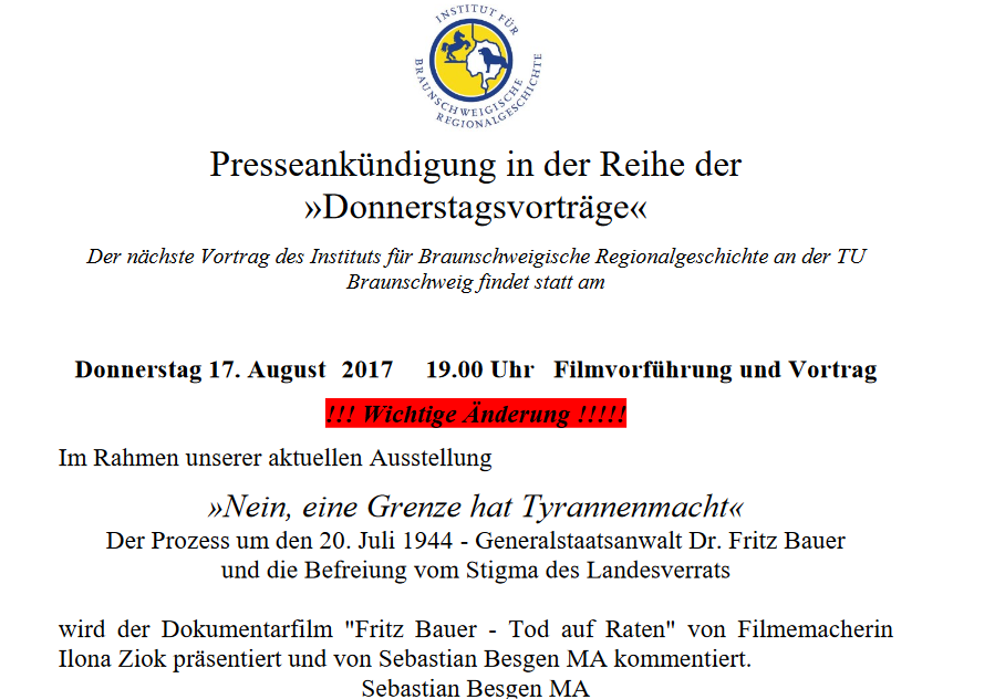Der Dokumentarfilm „Fritz Bauer – Tod auf Raten“ erzählt die Biographie des deutsch-jüdischen Juristen Fritz Bauer als ein lebenslanges Bemühen um mehr Mitmenschlichkeit und schildert Bauers mutigem Kampf für Gerechtigkeit. Mit Akribie hatte Filmemacherin Ilona Ziok Archive durchforscht und interessante Statements des braunschweigischen Generalstaatsanwalts aufgefunden. Um diese herum dokumentiert sie in Form eines filmischen Mosaiks Archivmaterial und die Aussagen von Bauers Zeitzeugen: Freunden, Verwandten und Mitstreitern zu einem eindrucksvollen Portrait eines der bedeutendsten Juristen des 20. Jahrhunderts. Im Kontext unserer Abschlußausstellung zu dem sog. Remerprozeß in Braunschweig stellt Sebastian Besgen den Film nochmals vor und berichtet über den Prozeß, in dem es Fritz Bauer gelang, dass erstmalig in Deutschland der NS-Staat von einem Gericht zum Unrechtstaat erklärt wird. Das Braunschweiger Verfahren war die Grundlage für die Rehabilitierung des Widerstands schlechthin und für viele spätere Verfahren gegen Nazis.