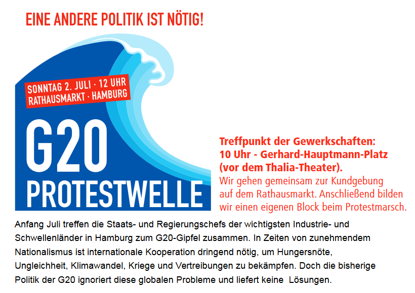 Eine ganz andere Politik muss her! Eine Politik für mehr Gerechtigkeit, mehr Nachhaltigkeit, mehr Transparenz und mehr Zusammenarbeit gegen soziale, ökologische und wirtschaftliche Verwerfungen. Mit zehntausenden Menschen fordern wir am Sonntag, den 2. Juli, von der G20 und der zukünftigen Bundesregierung: Weiter als PDF