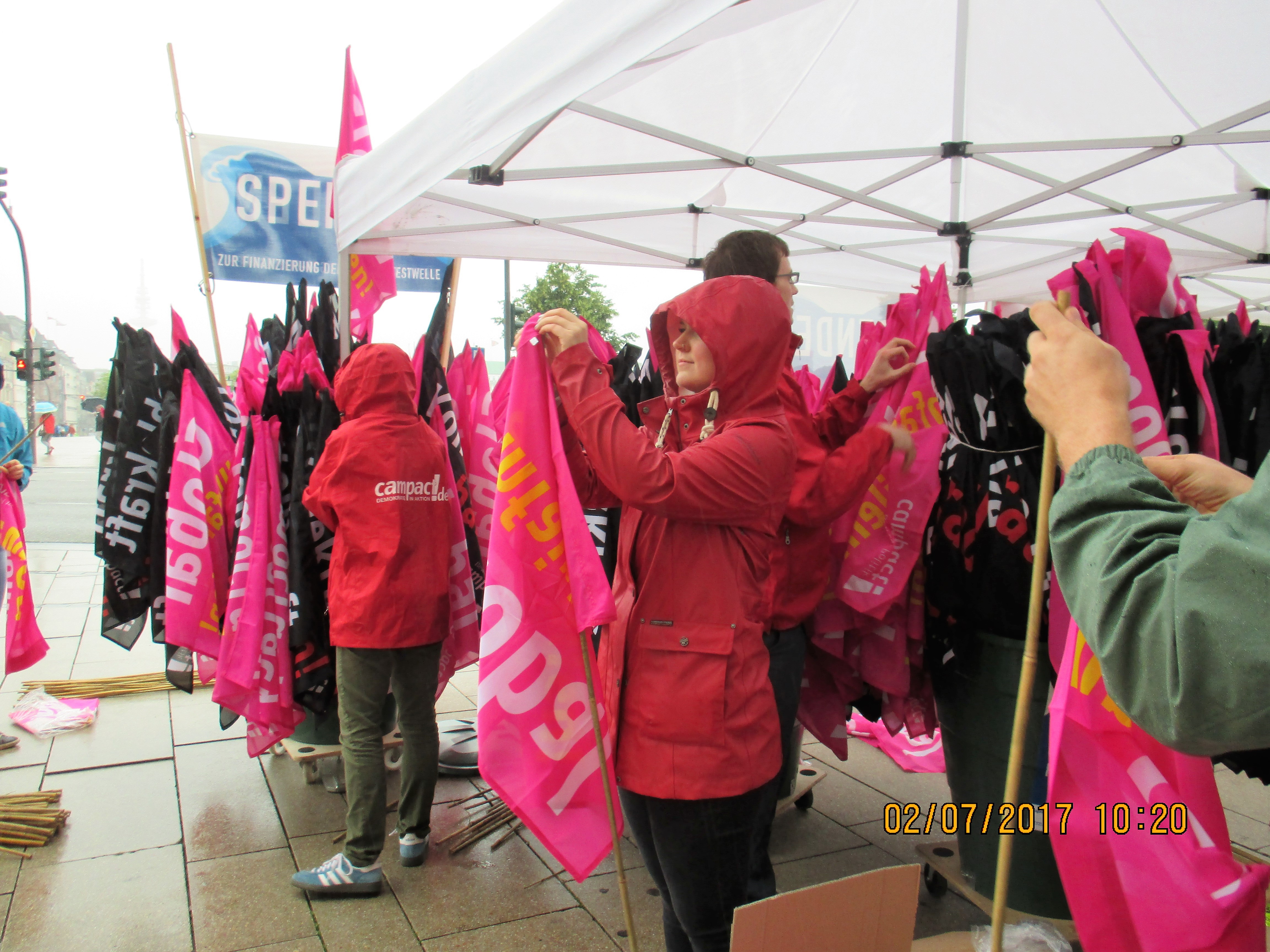 Das war ein großartiger Anblick: über 25.000 Menschen auf Hamburgs Straßen, mehr als 130 Flöße, Gummiboote und Kanus auf der Alster und tausende Banner und Fahnen in der Luft – und das trotz des anfänglichen Regens. Die Protestwelle zum G20-Gipfel am Sonntag in Hamburg war ein voller Erfolg. Vielen Dank, dass Sie das möglich gemacht haben!