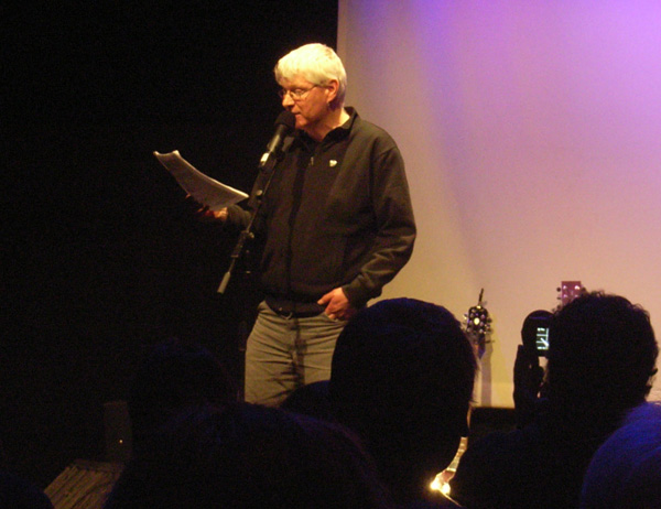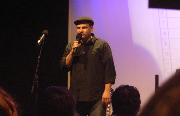 Zum ersten mal auf einer Poetry-Slam-Bühne steht der Braunschweiger Reinhard. Er ist Wassermann und Studienberater an der Technischen Universität, „wäre aber gerne Professor“, weiß Dominik. Akademisch-analytisch ist auch der Text, den Reinhard vorliest. Zwar gut, aber das Publikum bewertet auch den Vortrag, und deshalb gibt’s von fast allen eine 2. Nur ein Tisch vergibt eine 1, Dominik schießt sich gespielt empört auf den Schilderhochhalter ein: „Wir geben deine Adresse weiter, Reinhard weiß, wo dein Haus wohnt.“