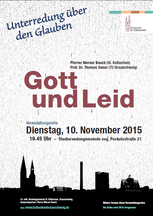 „Ungerecht!“ Unter diesem Titel fordert Professor Dr. Thomas Sonar von der TU Braunschweig den Theologen mit einem Vortrag zum Thema „Gott und Leid“ heraus. Am kommenden Dienstag, 10. November wird Katharinenpfarrer Werner Busch sich der Herausforderung durch den Braunschweiger Mathematiker stellen. An einem weiteren, dritten Abend der gemeinsam konzipierten Reihe „Unterredung über den Glauben“ wird über das Thema der Theodizee diskutiert.