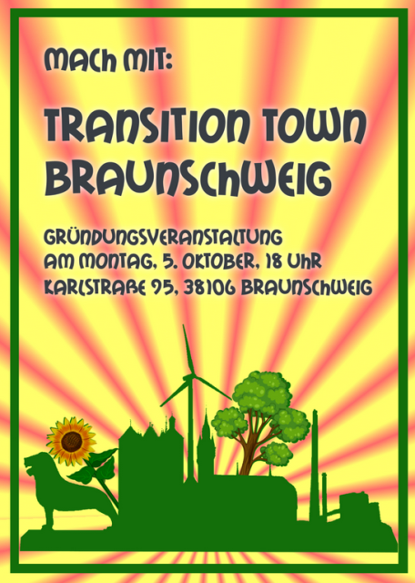 In diesem Sinne findet am 05. Oktober, 18:00 Uhr in der Karlstraße 95 die Gründungsveranstaltung für Transition Town Braunschweig statt. Es sollen die Akteure des Wandels zusammengeführt werden. Dabei spielt es keine Rolle ob institutionell oder Privatperson. Es geht darum, Synergien zu schaffen, gemeinsam Ideen für Braunschweig zu ersinnen und diese in Projekten direkt umzusetzen.