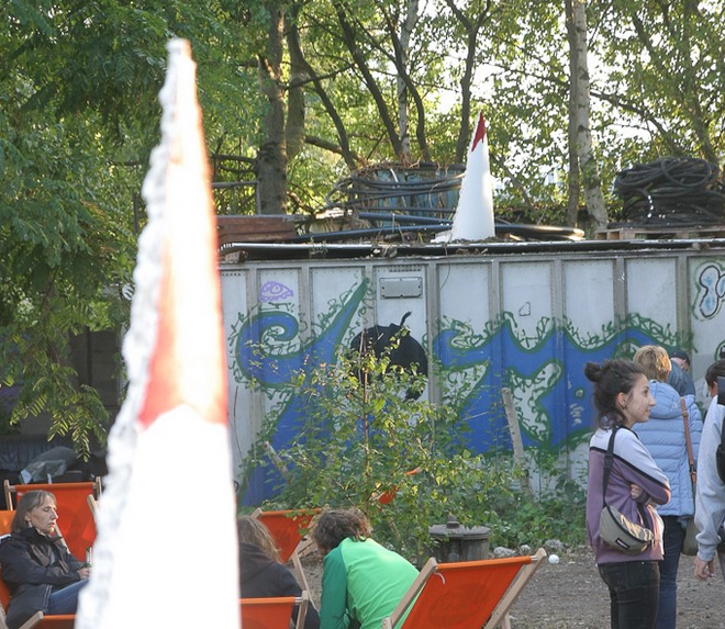 Schon beim Eintritt in das Ausstellungsgelände bellt den BesuchererInnen ein vermeintlicher Wachhund entgegen – tatsächlich ist es eine Installation von Ole Blank (Virtual presence, dog piece, 2018) und stellt, so die Intention, „subversiv den Zusammenhang zwischen der öffentlichen Straße und dem privatrechtlichen Raum um die H_LLE her“. Lauter Ansätze, die in der Sterilität eines musealen Gebäudes nicht möglich wären. Auch wenn der bedeckte Himmel und ein paar Regentropfen die Vernissage überschatteten (der Lichtskulptur „Consens“ von Enric Fort Ballester ermangelte es schlicht am Licht), nahm ein heiter gestimmtes Publikum diese neue Präsentationsfläche dankbar an. In der ungezwungenen Open-Air-Atmosphäre mit Reminiszenzen an Berliner Bauwagenplätze fühlten sich auch Kinder wohl. Kuchen, Kürbissuppe und eine Bretterbar mit Kaltgetränken zu DJ-Klängen liess Festival-Atmosphäre zu.