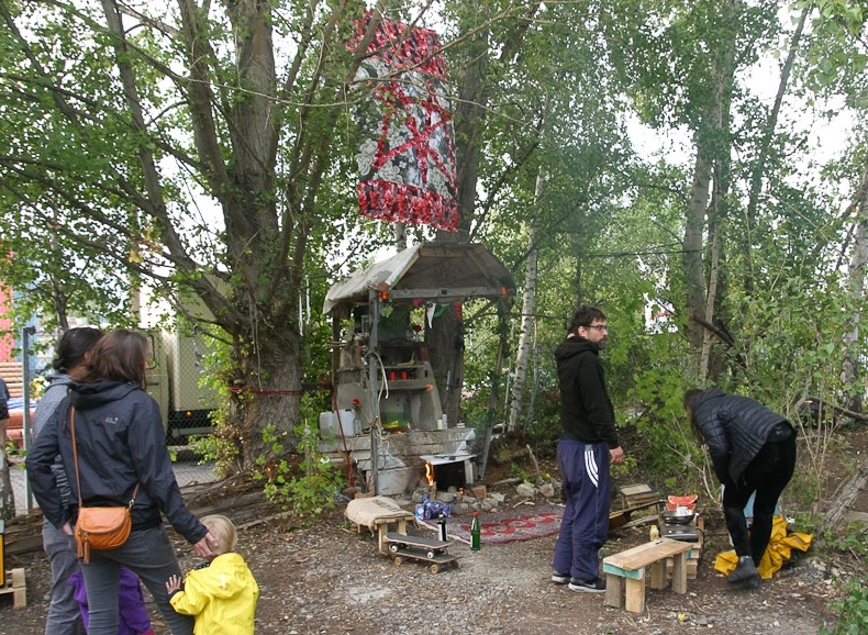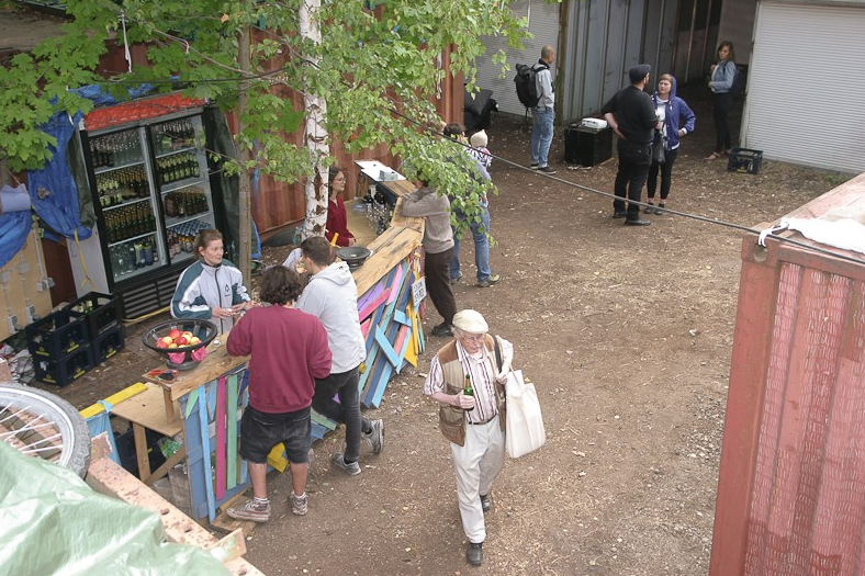 Fast selbst ein Kunstobjekt: Die selbstgezimmerte Open-Air-Bretterbar. Foto: Klaus Knodt