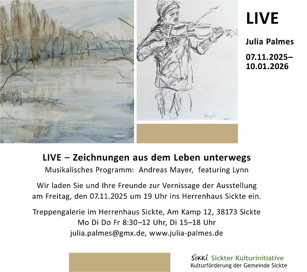 Bei den Konzerten im Herrenhaus Sickte ist Julia Palmes immer ein gern gesehener Gast und einige ihrer dort entstandenen Zeichnungen sind auch in der Ausstellung zu sehen.