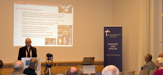 Professor Dr. Jörg Calließ, Historiker und Politologe (TU Braunschweig) und Dr. Wolfgang Heinrich (links im Bild) von Brot für die Welt – Evangelischer Entwicklungsdienst (Berlin) stellten in Kurzvorträgen dar, dass die friedenschaffenden Chancen ziviler Konfliktbearbeitung stärker als bisher wahrgenommen werden müssen. Militär kann bei internationalen Krisen und internen Konflikten Gewaltauseinandersetzungen unterdrücken. Aber Frieden zwischen verfeindeten Bevölkerungsgruppen schaffen, das erfordert mehr und langfristigeres Engagement! Das erfordert eine zivile Konflikttransformation.