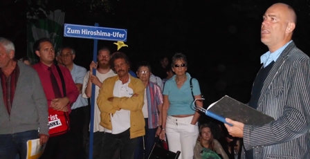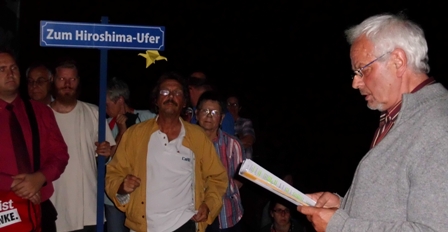 Es war ein würdevolles und beeindruckendes Gedenken an die Toten und Verwundeten von Hiroshima und Nagasaki. Die Kerzen brannten auf der Oker in Form eines Friedenszeichens. Knapp 100 Menschen waren dem Aufruf der Braunschweiger Friedensaktiven gefolgt. Sie erlebten ein beeindruckendes Kulturprogramm und waren tief berührt von dem Augenzeugenbericht über die Todesstunden vieler Menschen. Frau Brigitte Constein-Gülde las mit ihrer ausdrucksvollen Stimme als Erste vor.