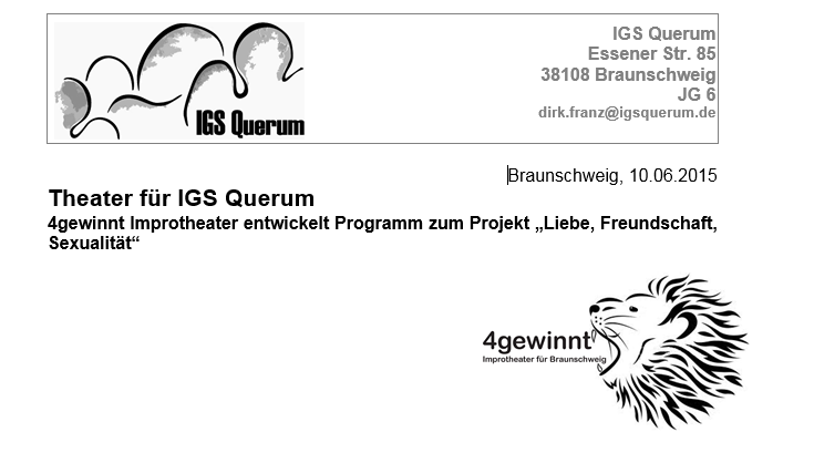 „Wir führen mit jedem 6. Jahrgang diese Projektwoche durch. Mit ihr wollen wir einen aktiven Beitrag zur Aufklärung, vor allem aber auch zu Toleranz leisten und so die Schüler vor Vorurteilen schützen“, sagt Jahrgangsleiter Dirk Franz. Neben Exkursionen zu z.B. Beratungsstellen wie Pro Familia, dem Besuch einer Gynäkologiepraxis und der Arbeit mit Jugendbüchern zum Projektthema steht auch Kultur auf dem Programm. „Theaterbesuche sind für uns Teil der ästhetischen Bildung. Gleichzeitig wollen wir allen Schülern unserer IGS Teilhabe am kulturellen Leben ermöglichen. Im Rahmen der Projektwoche nutzen wir Theater, um einen zwanglosen Zugang zum Thema zu ermöglichen“, so Franz. In diesem Jahr entschied sich die IGS Querum für einen Besuch beim Improtheater. Dorothee Horsch, Fabian Ahrendts und Matthias Köninger von 4gewinnt entwickelten darauf das Programm „Ganz aufgeklärt“. Gemeinsam mit ihren beiden Mitspielern werden sie das Programm am Freitag auf die Bühne bringen.